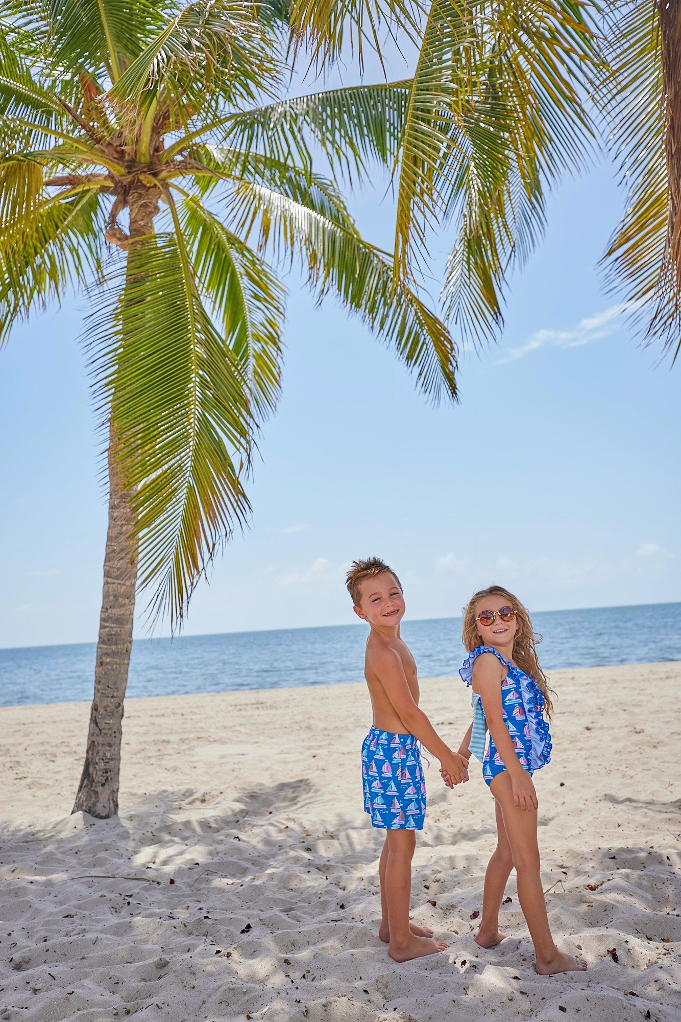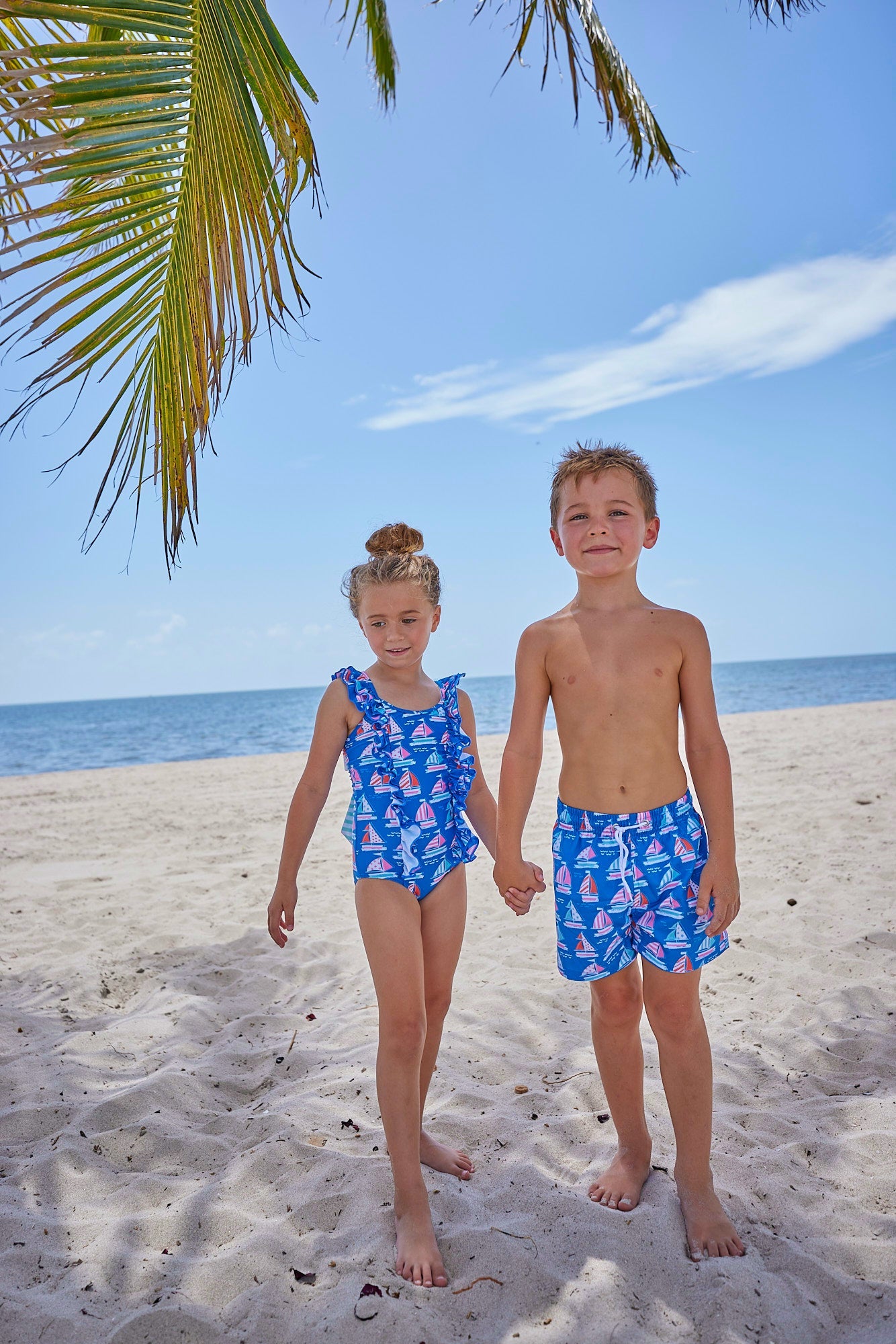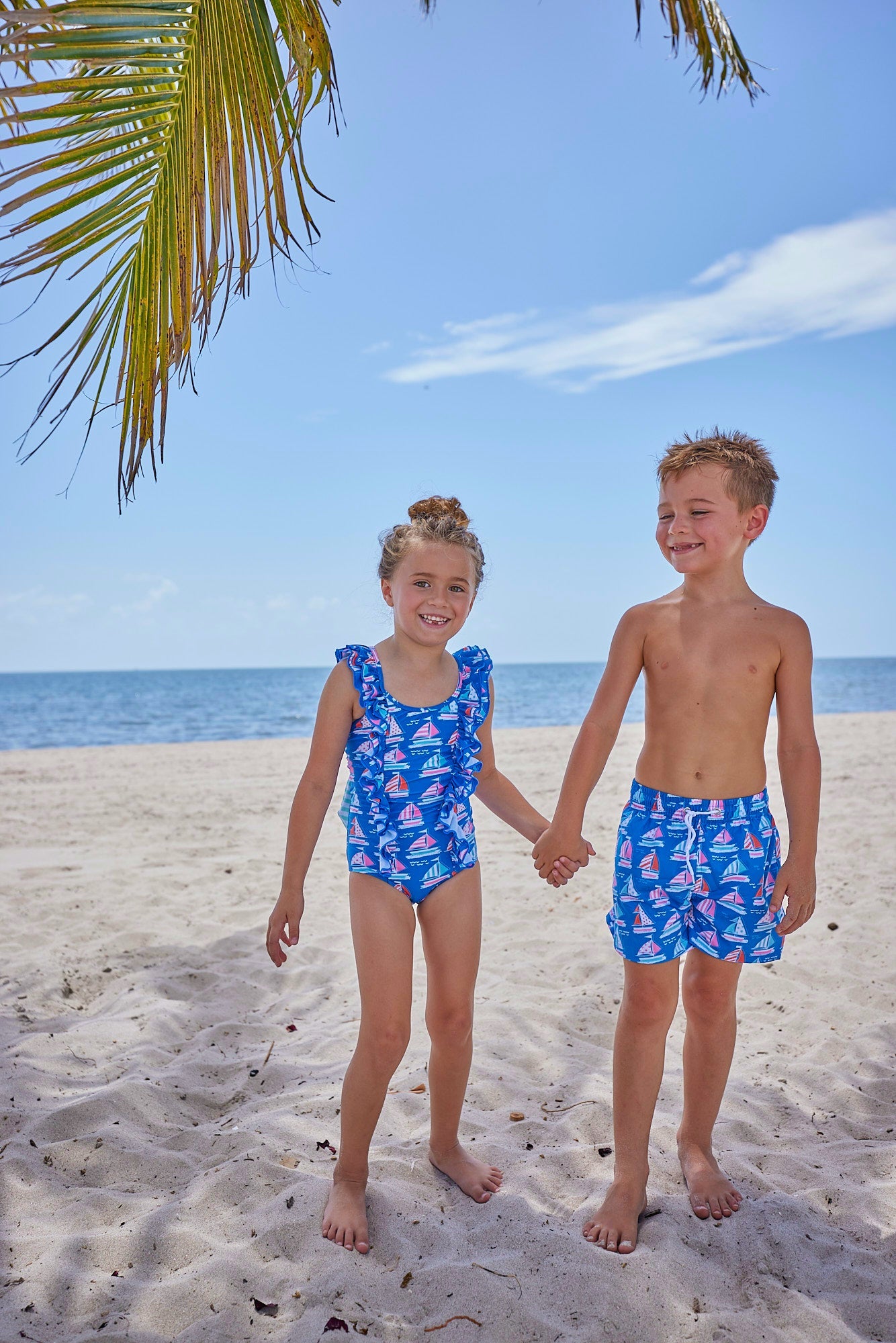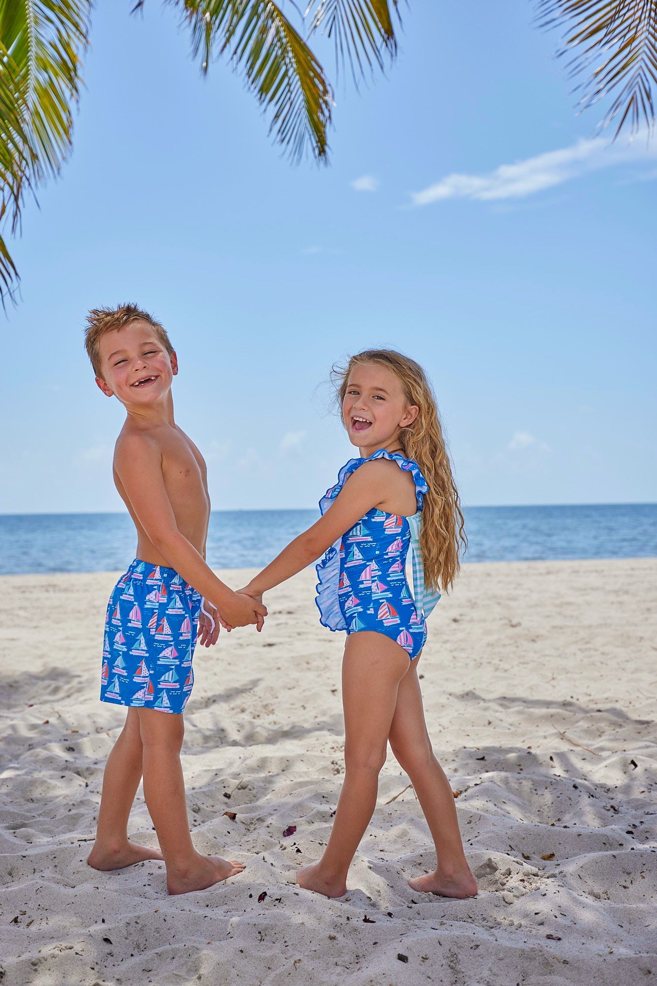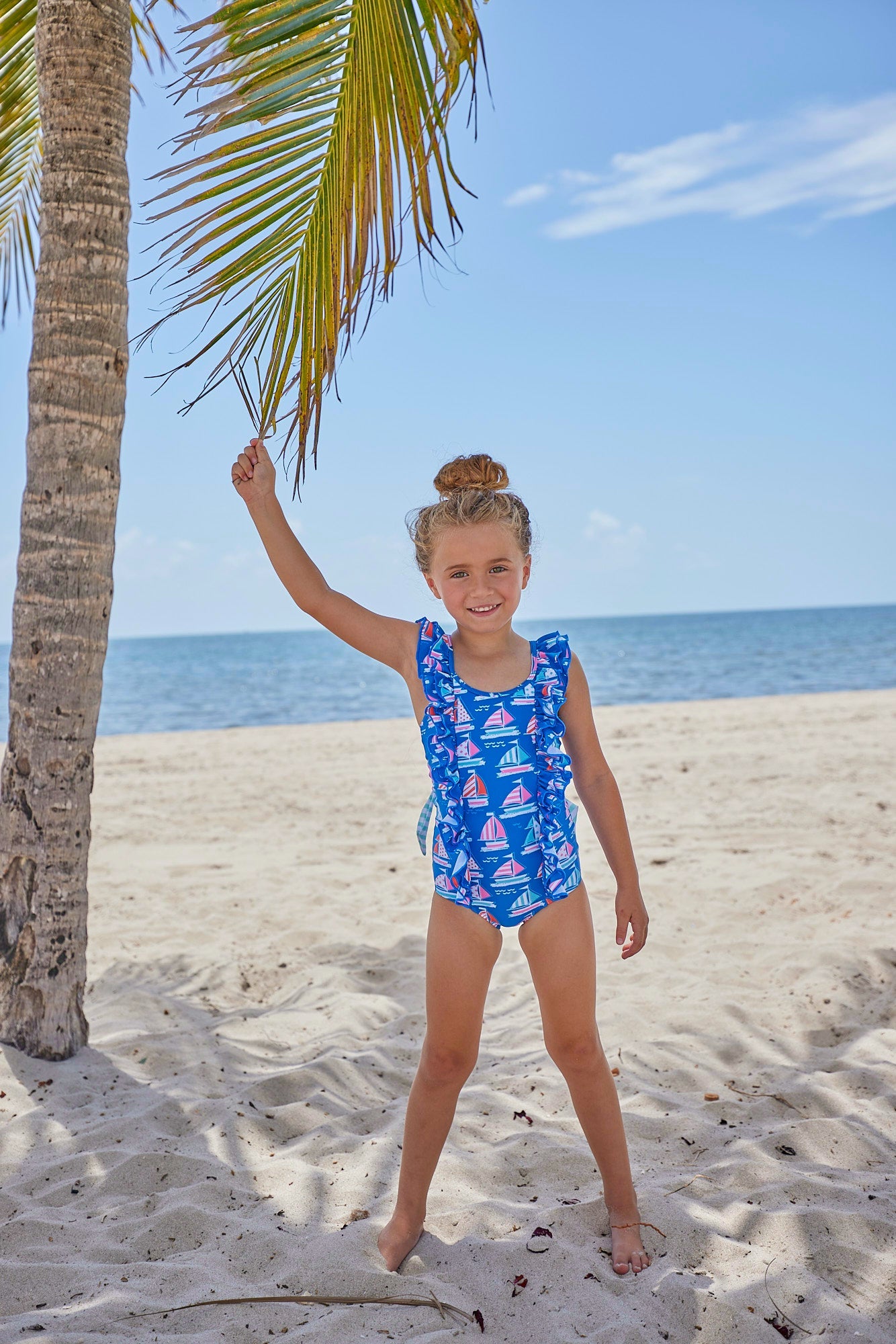 Style: This one piece style features all the bells and whistles with its cascading ruffles and beautiful bow detail on the back. The ruffles extend down the straps in the back and meet in the middle with a beautiful white bow made for all princesses on the beach.