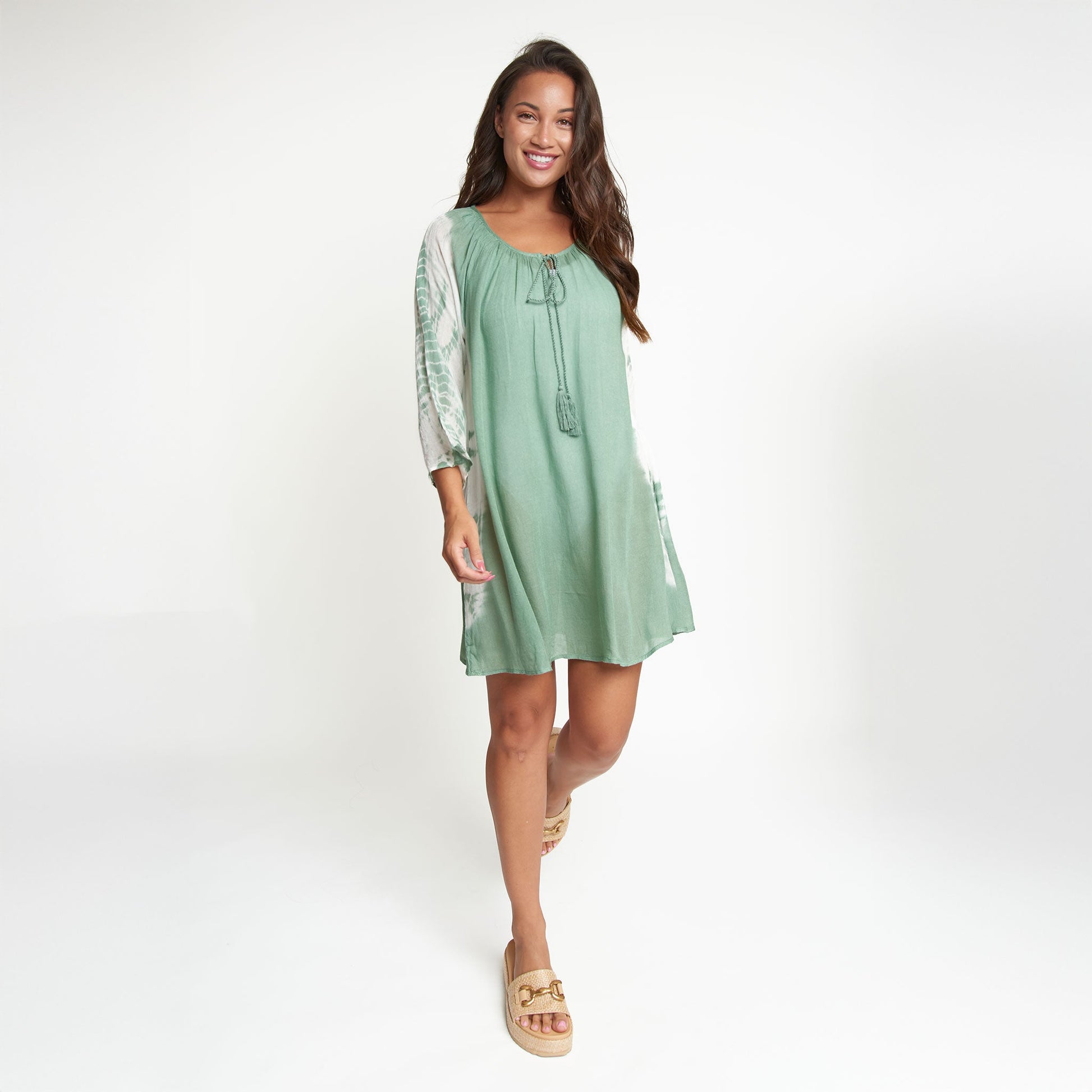A summer essential, the Larsa Raglan Tie Dye Tunic Cover Up features a vibrant hand tie dyed fabric - each piece is unique! This 3/4 sleeve tunic cover up is easy to wear and perfect for the beach, the pool, or lounging around your yard in the summer heat.