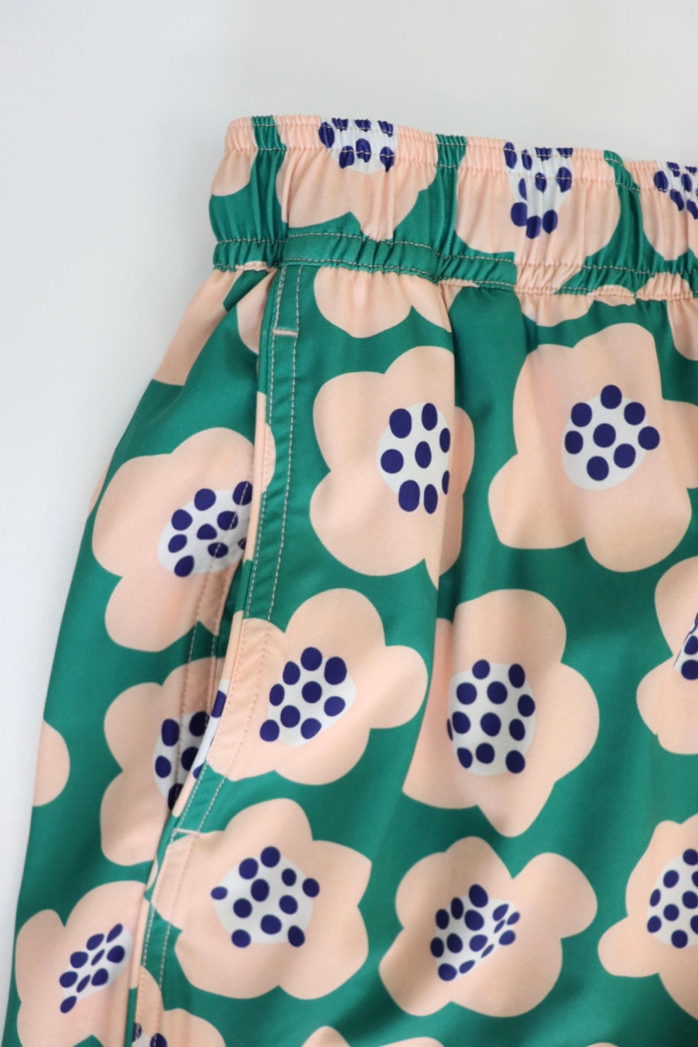 Our Men’s Poppy Swim trunks are lined with a mesh brief, have side seam pockets and an elastic and drawstring waist. These green swim trunks feature a peach Poppy floral pattern and are made with UV 50+ sun protection fabric from recycled material, they’re ready for endless summer adventures. Don’t forget to buy these other 2 matching styles for your little ones: the Boys Poppy Swim Trunks here or the zip front Kids Poppy Swimsuit here. Our swimsuits are crafted from an eco-friendly and sustainable techno-fabric made from 100% recycled polyester from pre and post-consumer waste.
