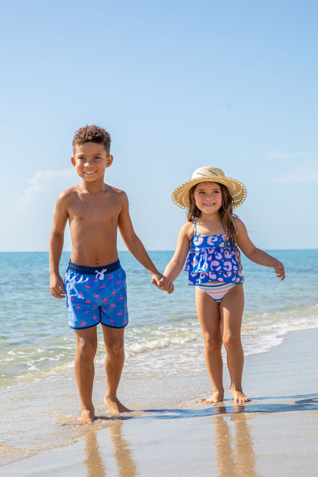 Print: This print features a royal blue fabric with pink flamingos. This trendy print is sure to brighten up any summer day.