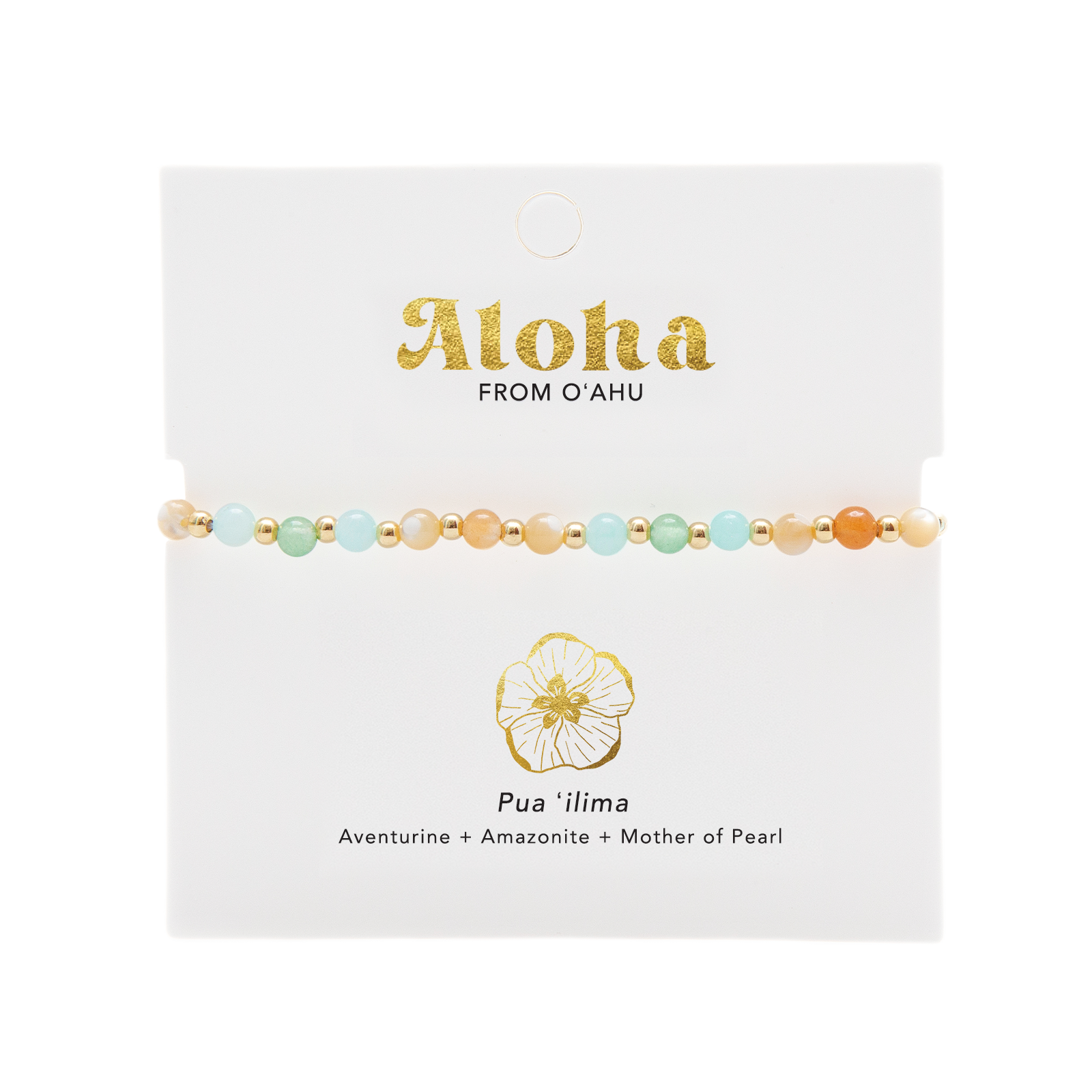 Just like a lei, this bracelet is strung together with Aventurine, Amazonite, and Mother of Pearl to adorn the wearer in good energy and invoke the same cherished feelings as one would feel when wearing a lei.
