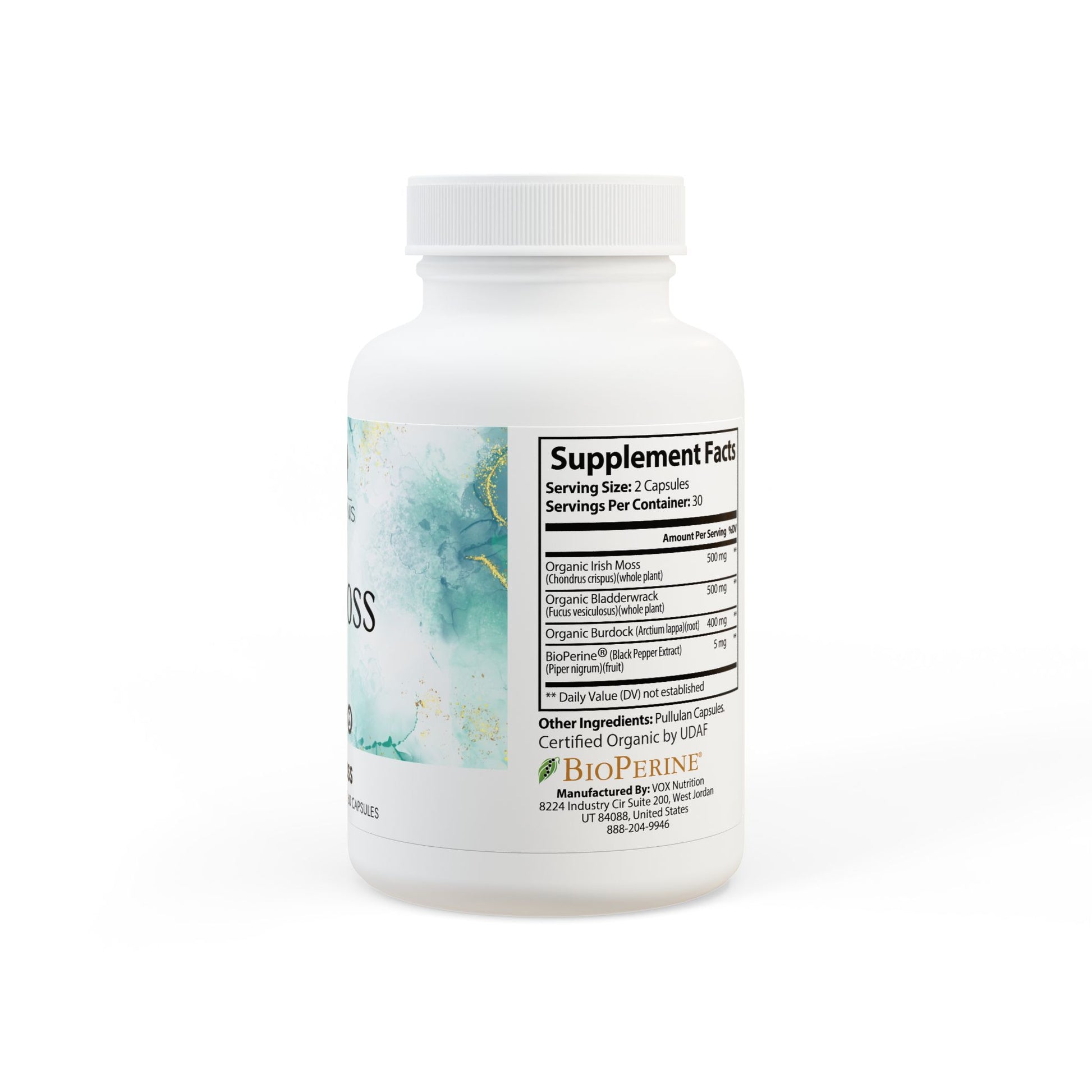 Ingredients: Organic Irish Moss (Chondrus crispus)(whole plant), Organic Burdock (Arctium lappa)(root), Organic Bladderwrack (Fucus vesiculosus)(whole plant), BioPerine® (Black Pepper Extract), (Piper nigrum)(fruit). Other Ingredients: Pullulan Capsules.