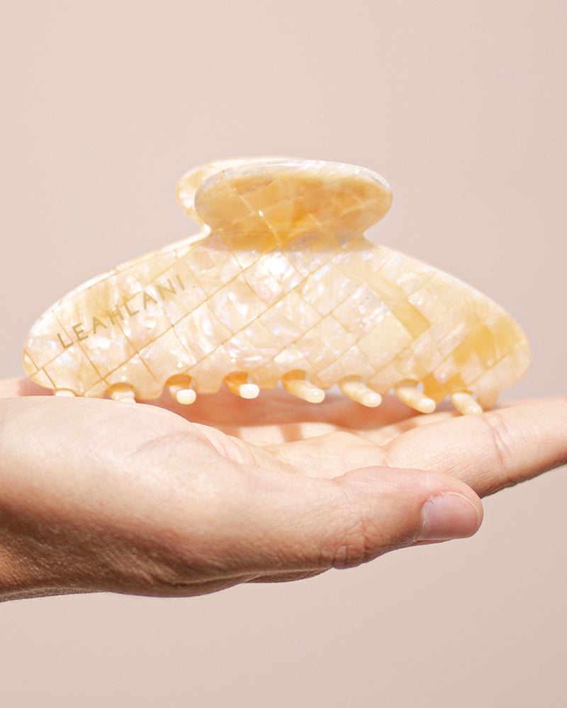 A Leahlani Exclusive! Reminiscent of sophisticated Mother-of-Pearl shells, with a classic, retro twist. The perfect hair clip to sweep up your tresses during your skincare rituals — or complete your outfit.