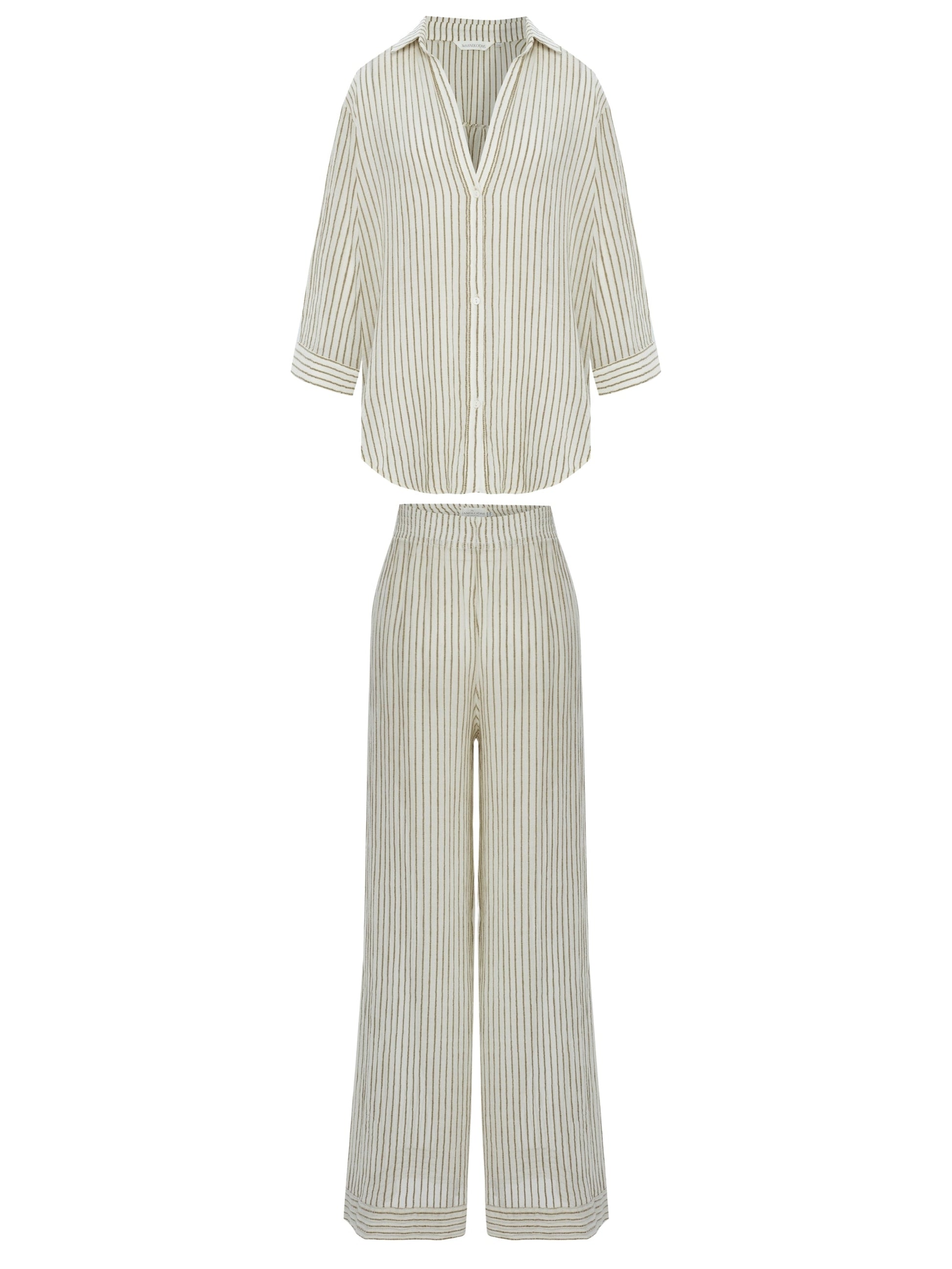 This modern Voyage Set Khaki Green Stripes brings a burst of energy for body, mind and style. 100% textured cotton cues calm and coastal while light texture brings freshness to your hot summer days. The Sheer Cotton makes you feel irresistibly comfy and comes with Voyage Pants.