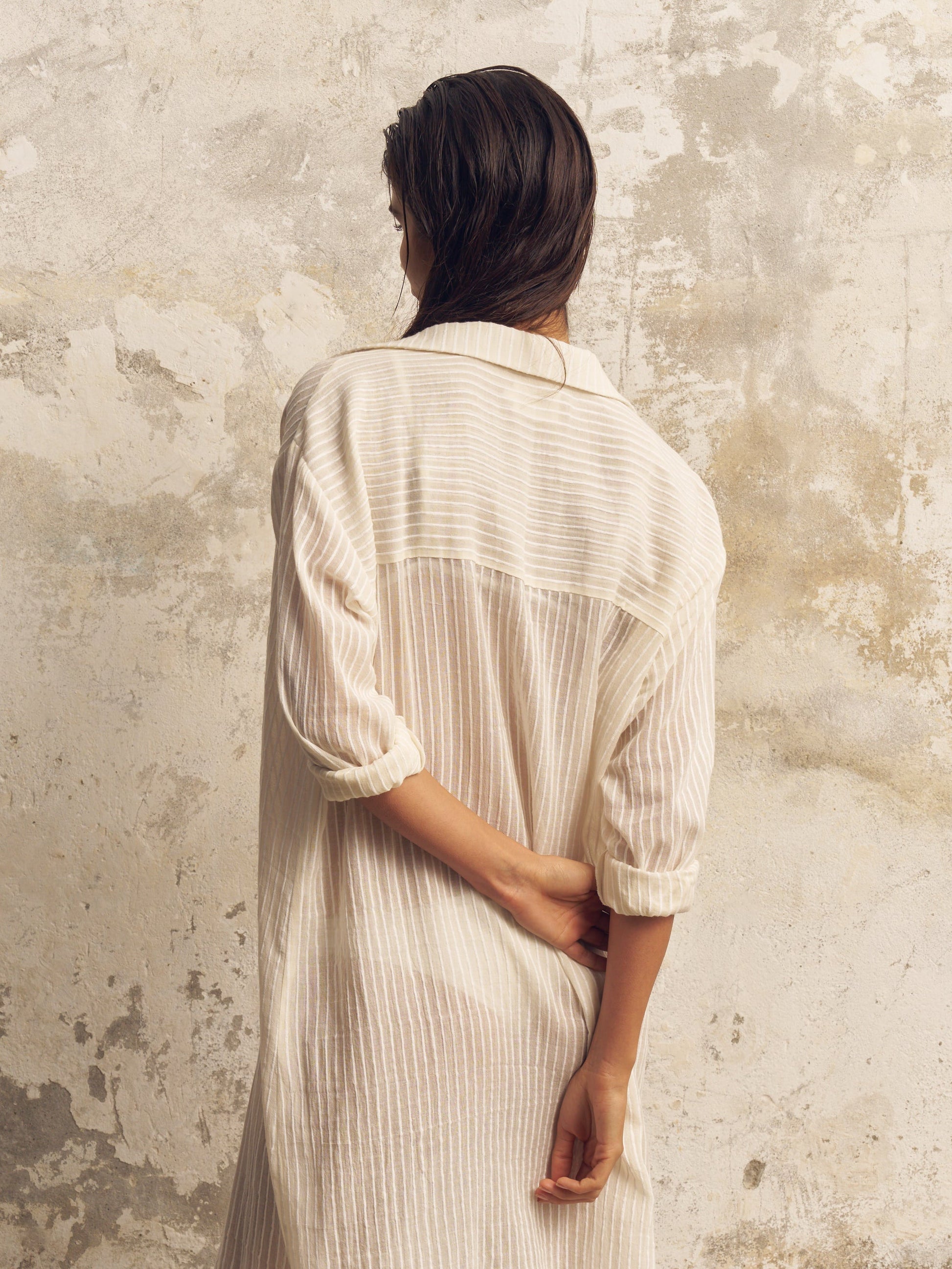 Featuring a button-down front and a relaxed fit, this versatile shirt dress offers effortless layering. Crafted from 100% Turkish cotton with soft, hand-loomed striped fabric, it can be worn open-front over swimwear or buttoned up as a chic beach cover-up. With a classic collar and rollable sleeves, it’s an essential addition to your summer wardrobe, perfect for beachside lounging or strolling through vacation days in style.